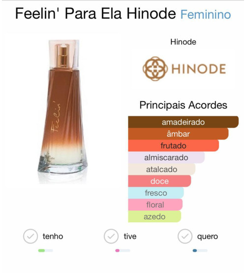 O Hinode Feelin' For Her Perfume 100 ml (muitas vezes chamado de Feelin For Her) é um perfume/desodorante colônia feminino da marca Hinode, criado para mulheres que buscam uma fragrância envolvente, feminina e marcante.
