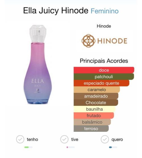 Resumo: Ella Juyce (ou Ella Juicy) da Hinode é uma fragrância feminina doce-frutada com nuances gourmand (caramelo e chocolate), pensada para mulheres que querem um perfume alegre, marcante e sensual.