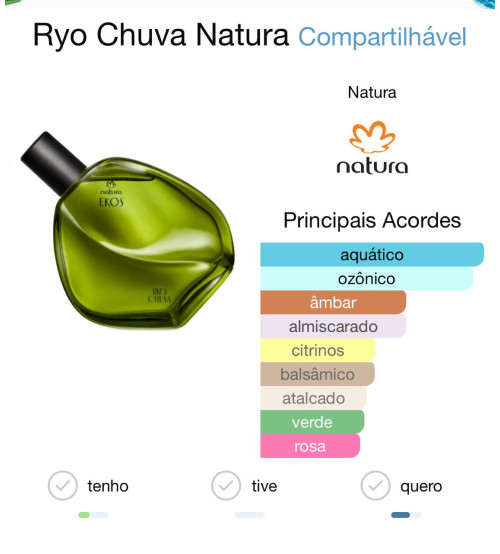 O Ekos Ryo Chuva é um perfume (deo colônia) da marca Natura que faz parte da linha Natura Ekos Ryos. Essa linha foi criada para representar os cheiros da natureza e dos rios da Amazônia.