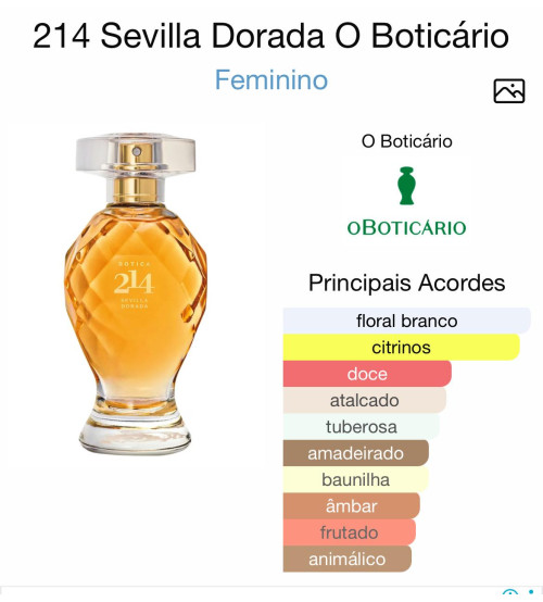 O Botica 214 Sevilla Dorada Eau De Parfum Floral Frutal é um perfume feminino da linha Botica 214, da marca brasileira O Boticário, lançado como uma fragrância inspirada na vibrante cidade de Sevilla, na Espanha.