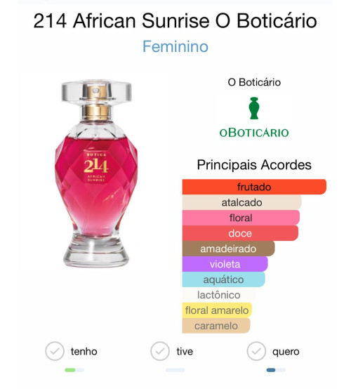 O Botica 214 African Sunrise Eau de Parfum Feminino, da O Boticário, é um perfume feminino da linha Botica 214 inspirado no amanhecer na savana africana. A ideia da fragrância é transmitir uma sensação solar, alegre e sofisticada, como se fosse uma viagem de balão ao nascer do sol na África.