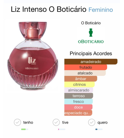 O Liz Intenso Desodorante Colônia 100ml – O Boticário é um perfume feminino mais forte e marcante da linha Liz. Ele tem um cheiro amadeirado e floral, criado para transmitir força, elegância e intensidade.