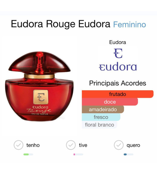 O Eudora Rouge é um perfume feminino marcante e sensual, conhecido por ser doce, frutado e floral, com um fundo amadeirado elegante. Ele foi criado para transmitir confiança, poder e feminilidade, inspirado na força da cor vermelha.