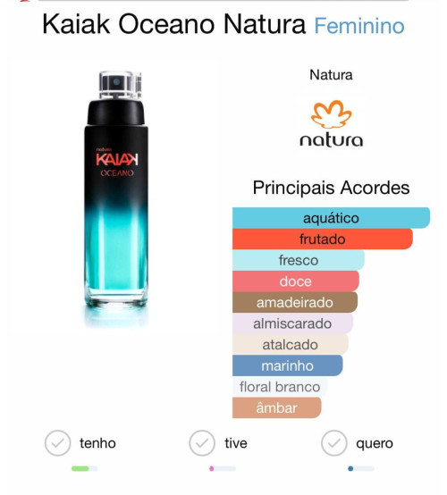 O Natura Kaiak Oceano Feminino é um perfume feminino (deo colônia) da linha Kaiak, inspirado no cheiro fresco do oceano. Ele foi lançado em 2021 e tem uma fragrância floral aquática, ou seja, fresca, leve e com sensação de mar.