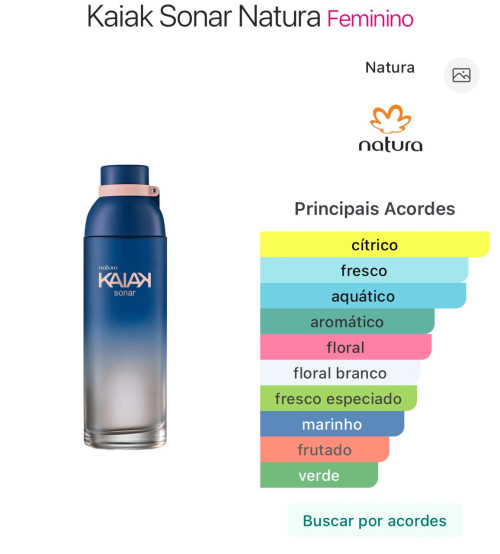 O Kaiak Sonar Feminino da Natura é um perfume feminino (deo colônia) inspirado no frescor do oceano. Ele é uma fragrância floral frutada com notas aquáticas, criada para transmitir sensação de energia, natureza e mar.