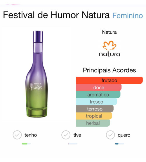O Natura Festival de Humor Feminino 75 ml é um perfume da linha Humor da marca Natura. Ele é uma desodorante colônia feminina criado para transmitir uma sensação de alegria, energia e clima de festivais.