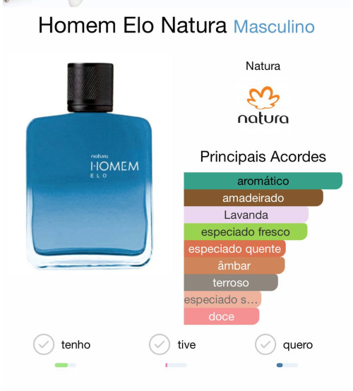 O Homem Elo da Natura é um perfume masculino amadeirado e sofisticado, com cheiro forte, elegante e duradouro.