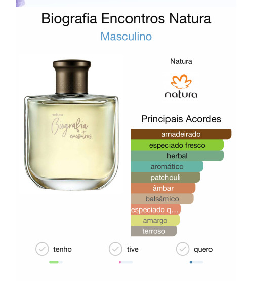 O Biografia Encontros Masculino da Natura é um perfume masculino (deo colônia) com fragrância aromática, especiada e amadeirada. Ele foi criado para transmitir momentos especiais e encontros marcantes entre pessoas.