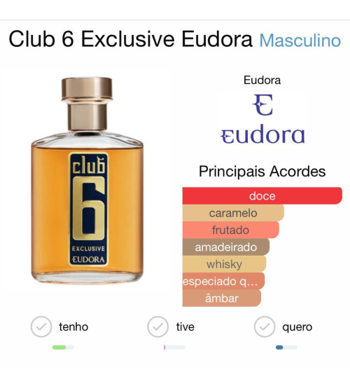 O Eudora Club 6 Exclusive é um perfume masculino intenso, doce e sofisticado da linha Club 6 (linha de perfumes da Eudora).