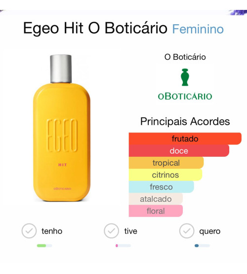 O Egeo Hit Desodorante Colônia 90ml é um perfume da marca brasileira O Boticário. Ele é conhecido por ter um cheiro frutado, doce e tropical, pensado principalmente para quem gosta de fragrâncias jovens e refrescantes.