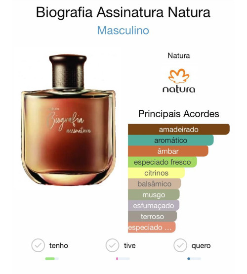 O Biografia Assinatura Masculino da Natura é um perfume masculino (deo colônia) com fragrância amadeirada, aromática e levemente fresca. Ele foi lançado em 2019 e faz parte da linha Biografia, criada para representar a história e a personalidade de cada pessoa.