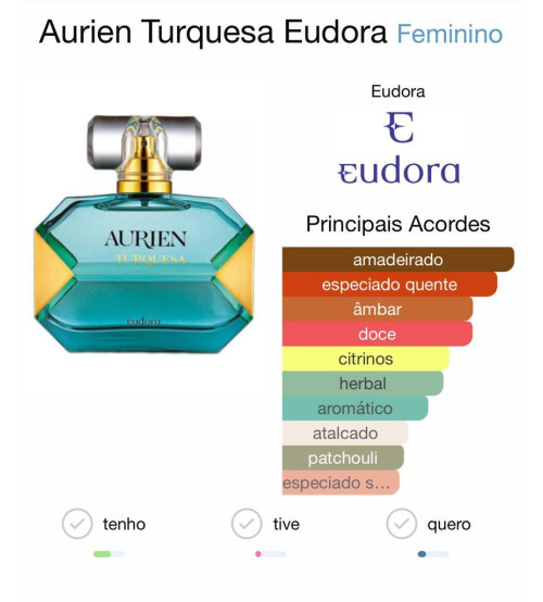 Aurien Turquesa é um perfume feminino da Eudora, parte da linha Aurien, que se inspira nas pedras preciosas (no caso, a turquesa) e busca transmitir uma sensação de elegância, sofisticação e personalidade marcante na fragrância.