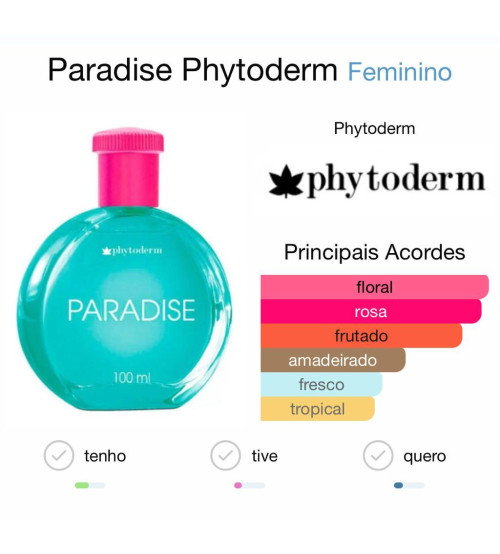 O Paradise da Phytoderm é um perfume feminino (deo colônia) conhecido por ter um cheiro doce, floral e frutado, com um toque moderno e sensual.