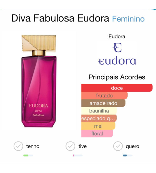 O Diva Fabulosa da Eudora é um perfume feminino (desodorante colônia) com proposta de ser marcante, doce e sofisticado, feito para quem quer chamar atenção e se destacar.