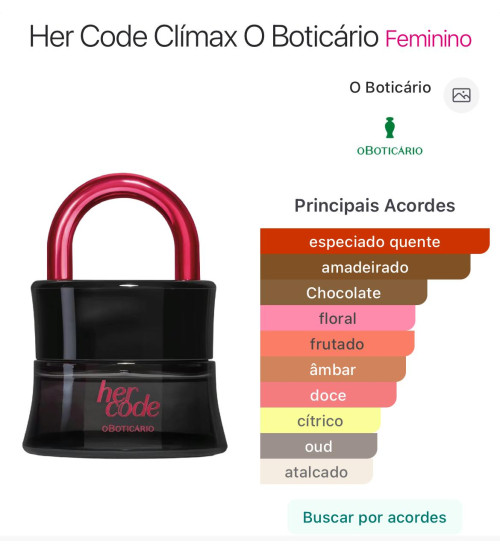 O Her Code Clímax Eau de Parfum 50 ml (também encontrado em tamanhos menores como 10 ml) é um perfume feminino da linha Her Code do O Boticário criado para ser sensual, intenso e marcante, com uma proposta olfativa sofisticada e envolvente.