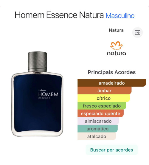 Natura Homem Essence é um perfume masculino (deo parfum) da linha Natura Homem, conhecido por ser sofisticado, amadeirado e levemente especiado.